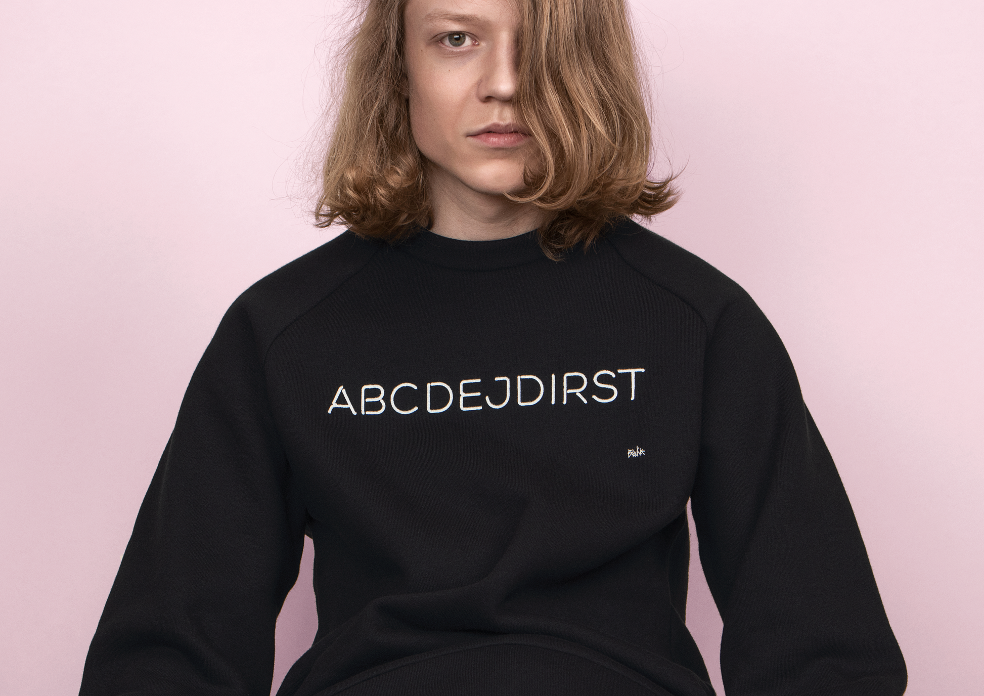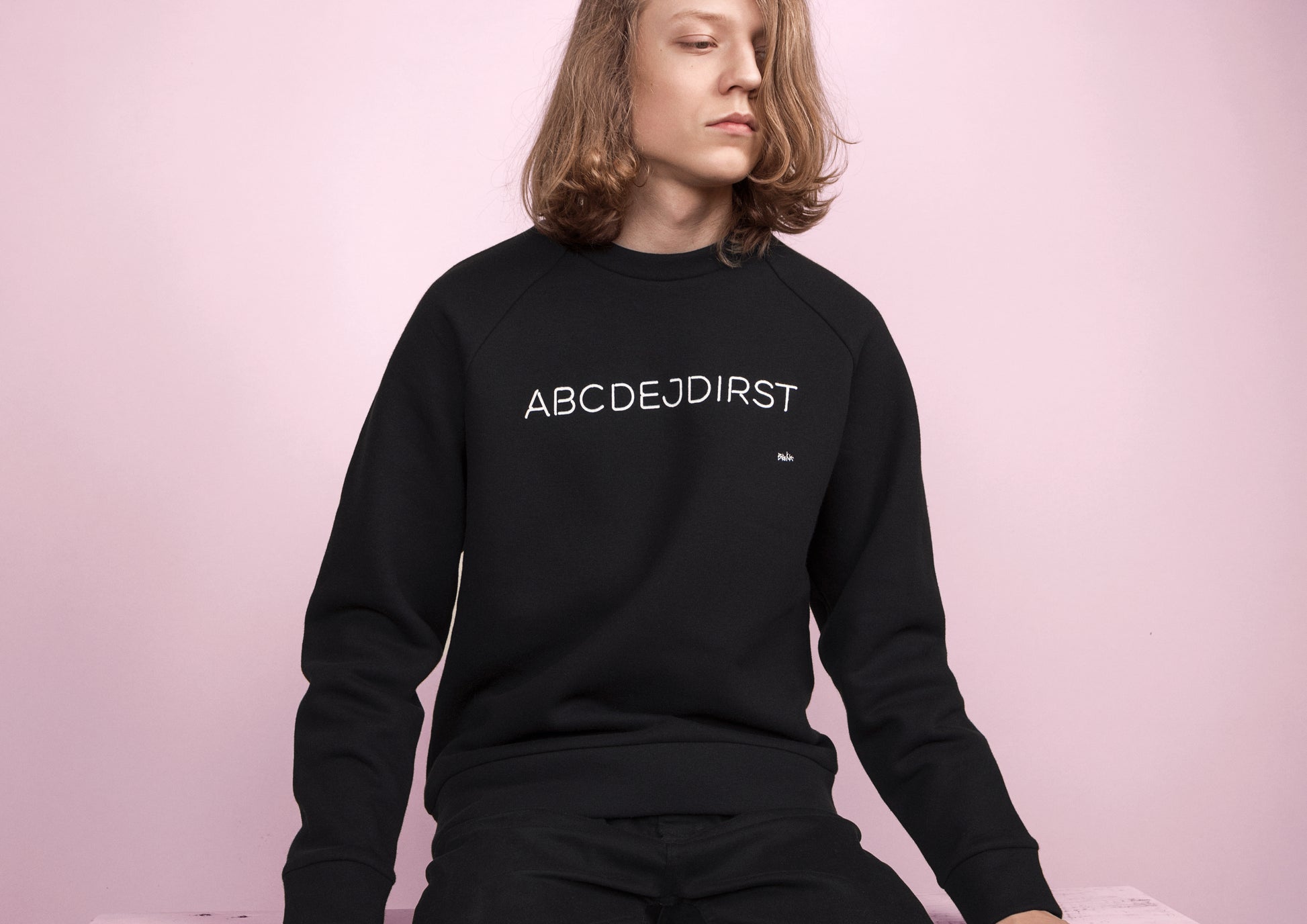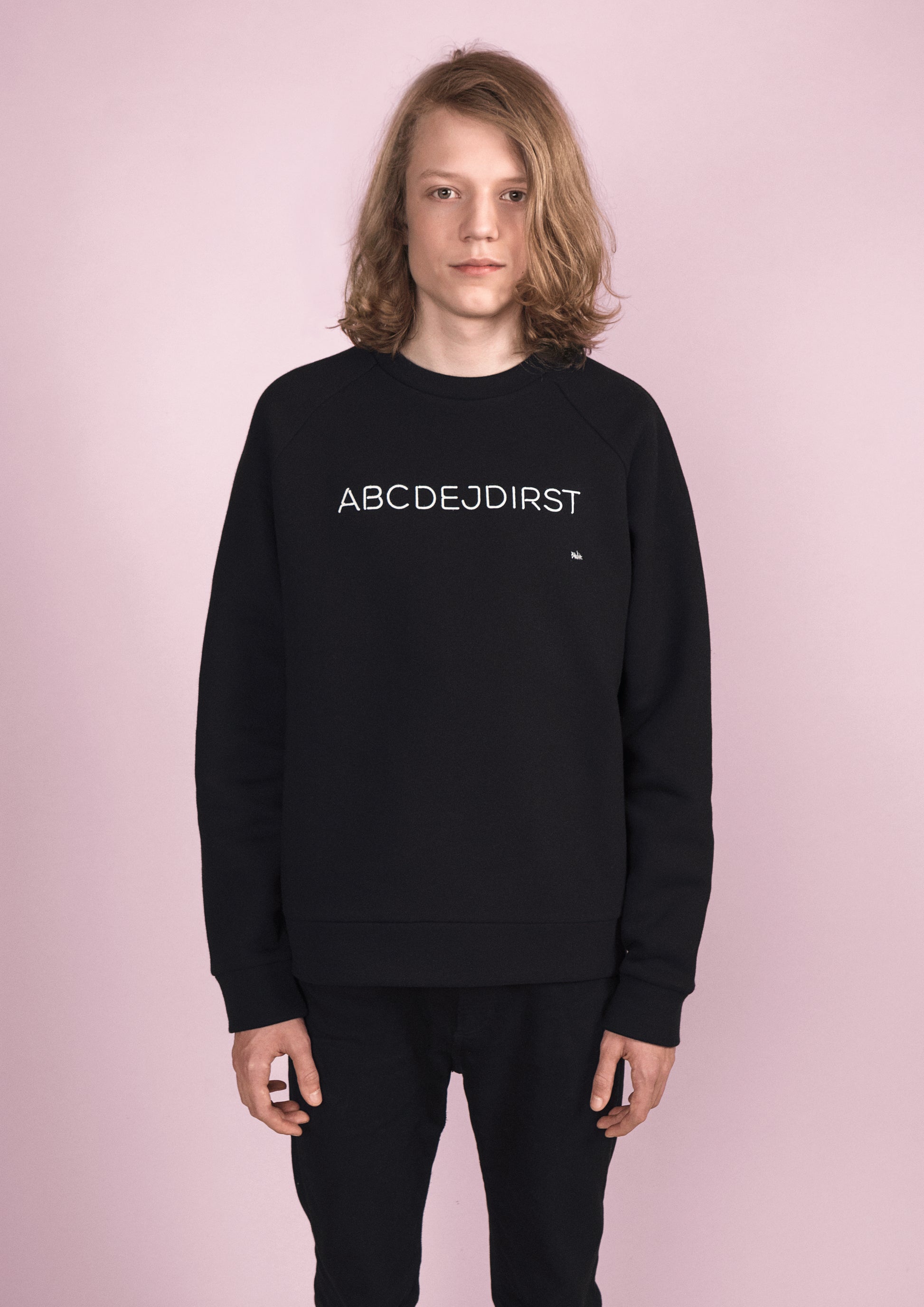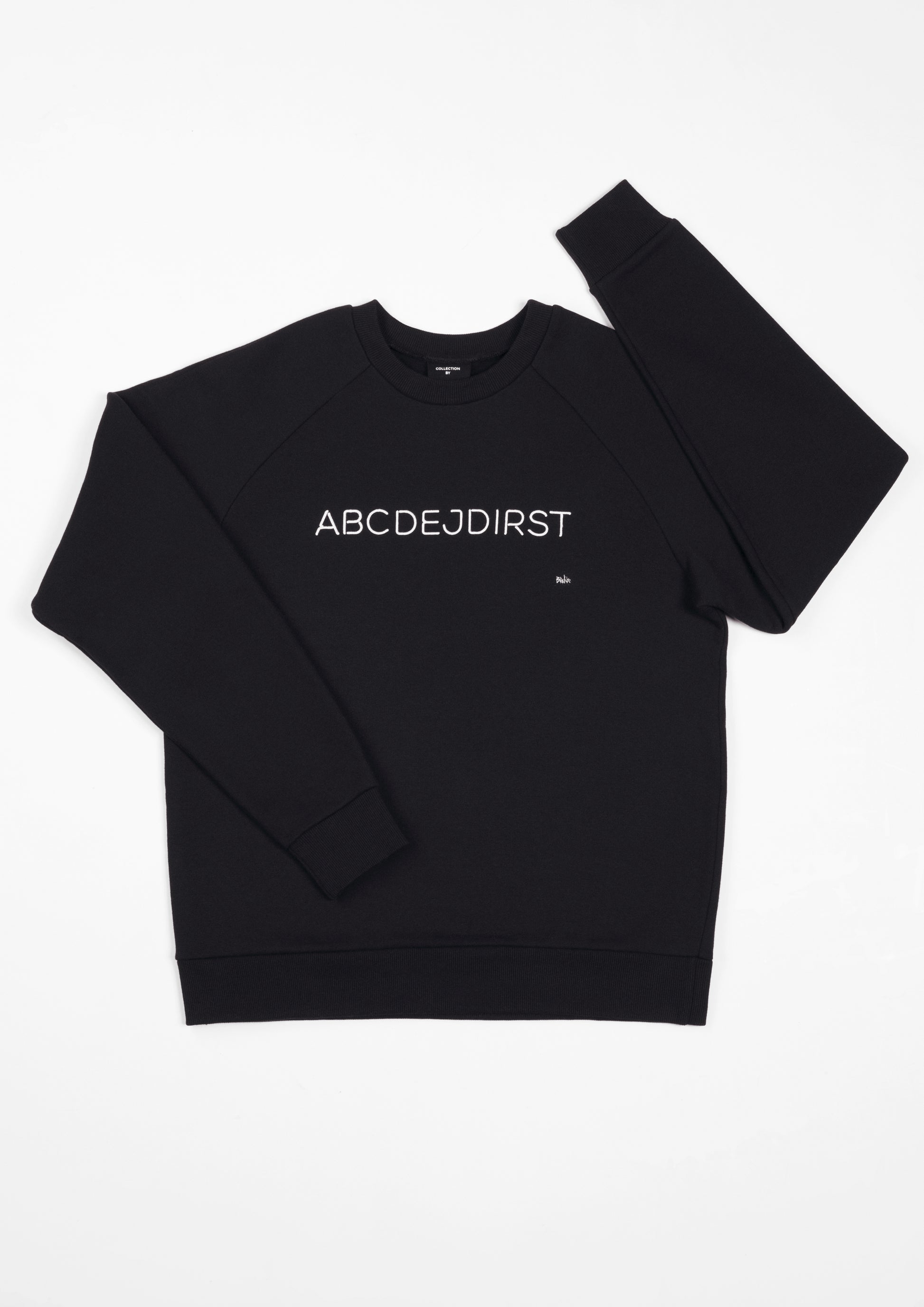 Melns unisex kokvilnas džemperis ar "ABCDEJDIRST" apdruku sietspiedē.